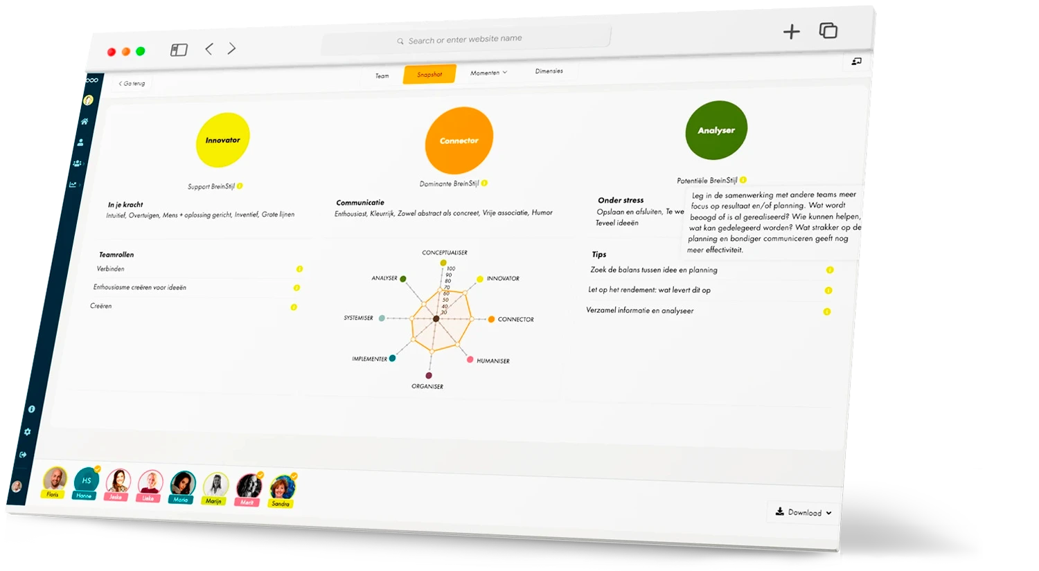 Hoe zit ik in elkaar en hoe verhoudt zich dat tot de rest van mijn team? BreinStijl geeft inzicht in jouw werkstijl en die van je collega’s. Je kunt zoveel projectteams samenstellen als je wilt. Iedereen krijgt interactieve adviezen en tips om kwaliteiten gerichter in te zetten. Van zichzelf én van teamleden.
